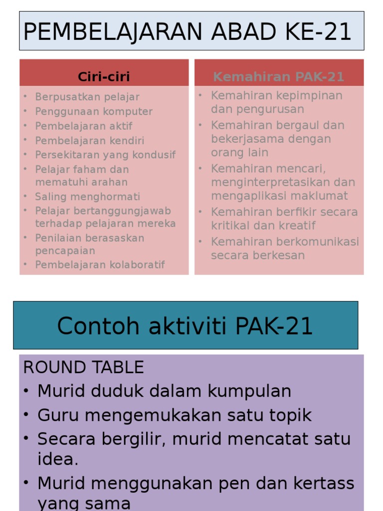 Abad 21 Learning Note Notes from www.myprivatetutor.my Mahir dalam berkomunikasi iaitu menyampaikan maklumat dan bertukar pendapat dengan orang lahir. Pelajar mempunyai akauntabiliti yang tinggi, boleh diharapkan dan dapat beradaptasi dengan persekitaran dan rakan sekelas lain. Membina profil murid ciri abad ke 21. 4k adalah kemahiran yang perlu diterapkan kepada murid selaras dengan cabaran kehidupan abad ke21. Justeru itu juga, proses pembelajaran dalam bilik darjah perlu merangkumi literasi teknologi, pembelajaran kolaboratif. Maka, cara pembelajaran tradisonal tidak sesuai lagi. Bijak menyoal guru ketika berada di dalam bilik darjah. Dalam meniti abad ke 21, kemahiran pedagogi menuntut seseorang guru memiliki kemahiran.